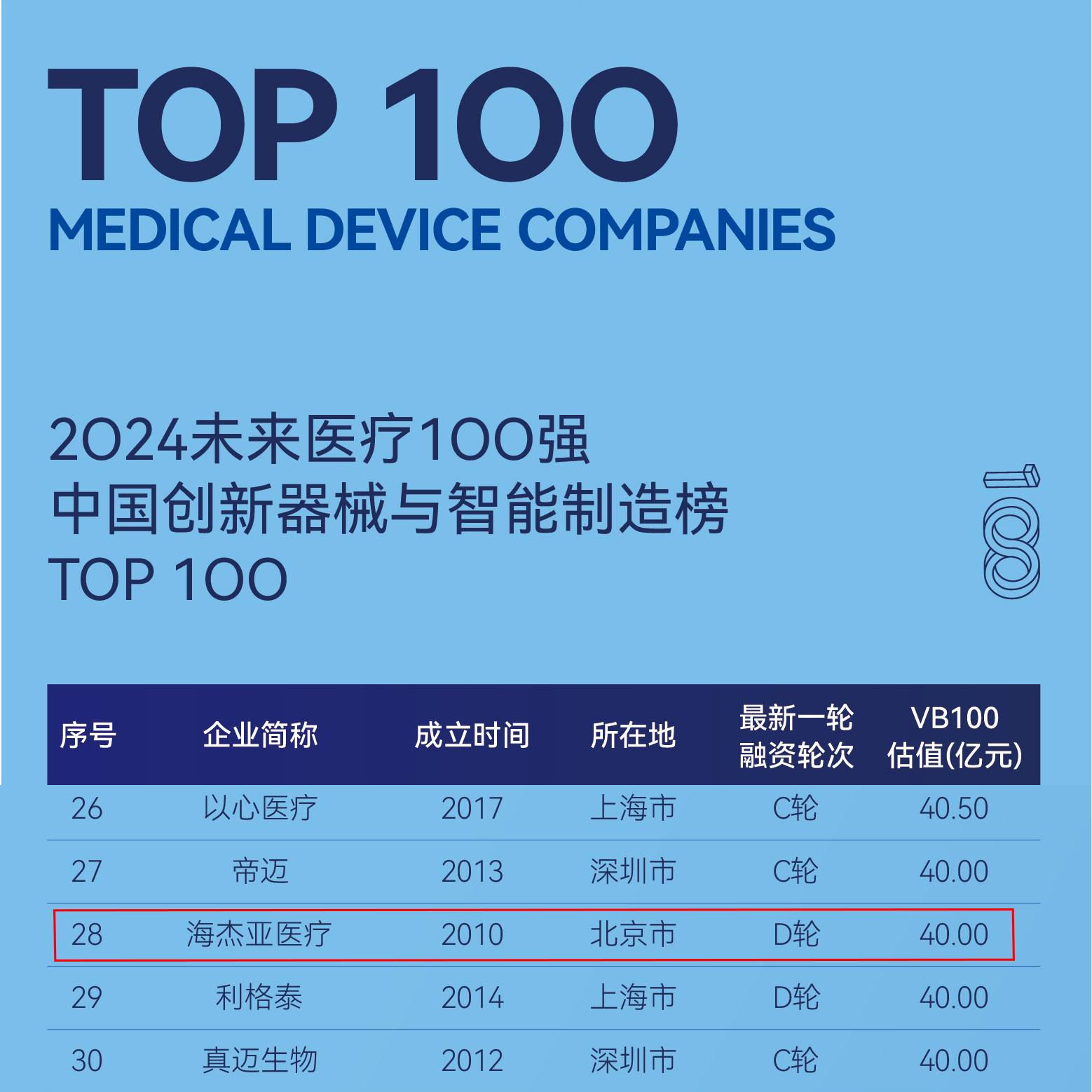 未來醫(yī)療100強(qiáng)榜單,創(chuàng)立于2015年,是由VB100、動脈網(wǎng)、蛋殼研究院推出的國內(nèi)第一個針對非上市企業(yè)的創(chuàng)新醫(yī)療領(lǐng)域榜單,旨在遴選真正代表未來醫(yī)療的中國創(chuàng)新醫(yī)療者,發(fā)現(xiàn)我國未來醫(yī)療產(chǎn)業(yè)的核心力量,推動健康醫(yī)療產(chǎn)業(yè)的創(chuàng)新變革進(jìn)程。